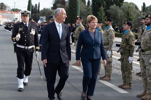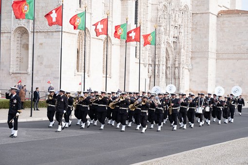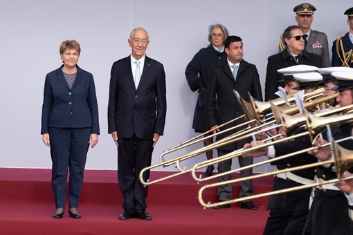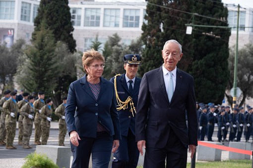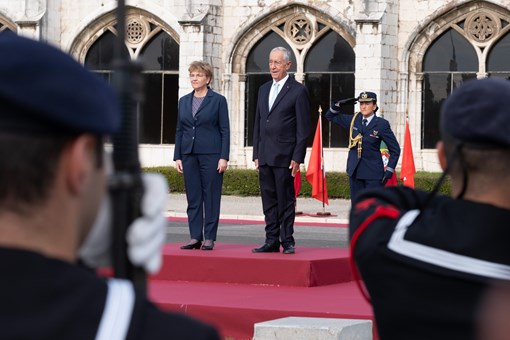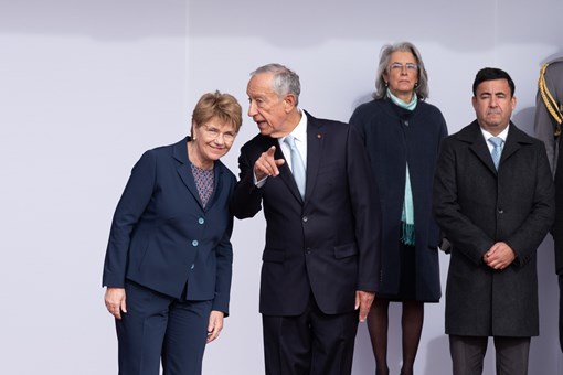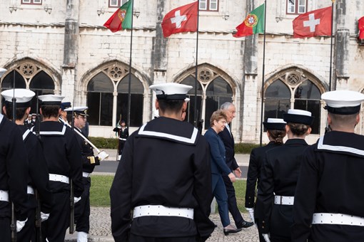 A Presidente da Federação Suíça foi recebida pelo Presidente da República na Praça do Império - Mosteiro dos Jerónimos, em Lisboa, numa cerimónia oficial de boas-vindas. Foram prestadas Honras Militares, com a execução dos Hinos Nacionais dos dois países, salva de 21 tiros, revista e desfile da Guarda de Honra.