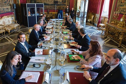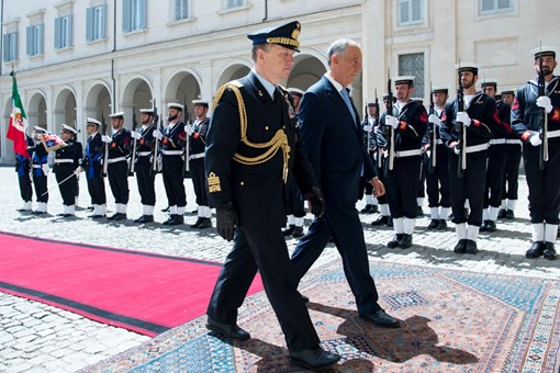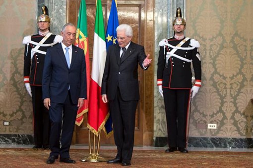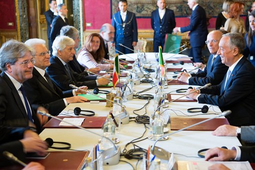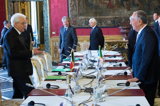 Após ter sido recebido no átrio de honra do Palácio do Quirinale por um piquete militar, o Presidente Marcelo Rebelo de Sousa reuniu-se com o seu homólogo e respetivas comitivas na Sala del Bronzino.