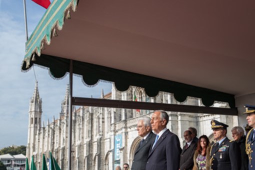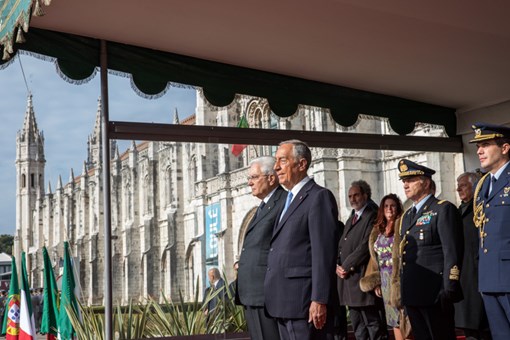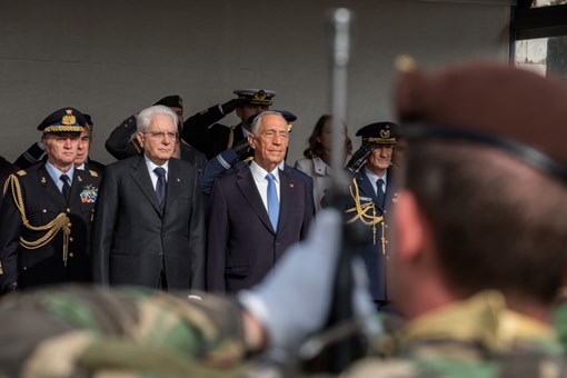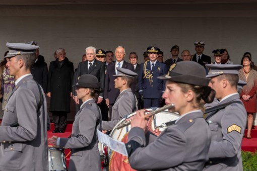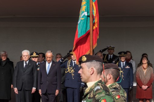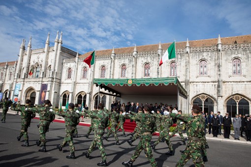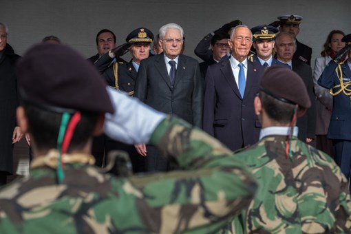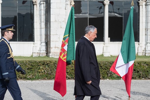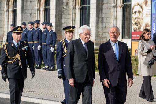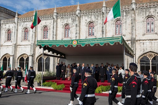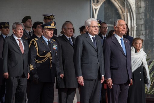 O Presidente da República Italiana, Sergio Mattarella, foi recebido na Praça do Império - Mosteiro dos Jerónimos, pelo Presidente da República, numa cerimónia de boas-vindas, onde foram prestadas Honras Militares, com a execução dos Hinos Nacionais dos dois países, salva de 21 tiros e desfile da Guarda de Honra.