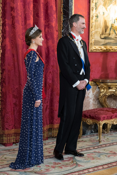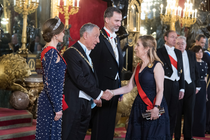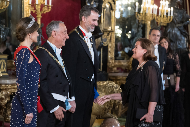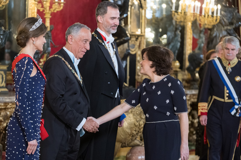 Após a chegada e os cumprimentos aos convidados na Sala do Trono, os dois Chefes de Estado e a Rainha Letizia dirigiram-se à sala de jantar, onde foram executados os hinos nacionais e usaram da palavra o Rei de Espanha e o Presidente da República.
