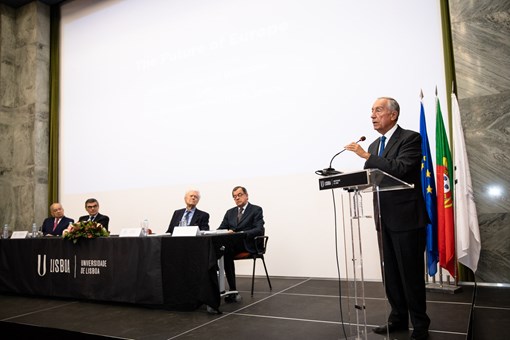 O Presidente Marcelo Rebelo de Sousa presidiu, no Salão Nobre da Reitoria da Universidade de Lisboa, à Sessão de apresentação do Livro “The Future of Europe - The Reform of the Eurozone and the Deepening of Political Union” de Fausto de Quadros e Dusan Sidjanski.