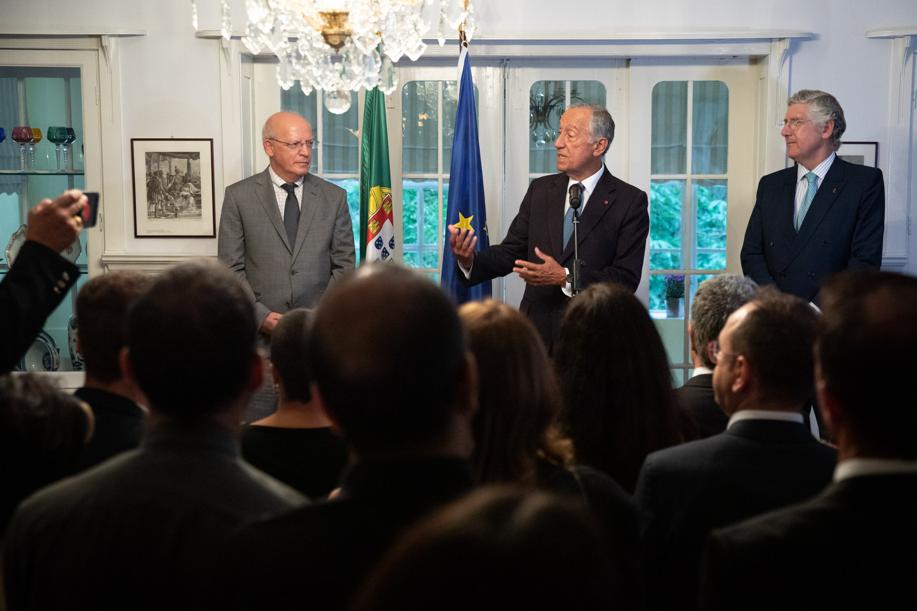 Na Residência do Embaixador de Portugal em Berlim, o Presidente da República participou, acompanhado pelo Ministro dos Negócios Estrangeiros, Augusto Santos Silva, num encontro com cerca de três centenas de portugueses residentes na capital alemã.