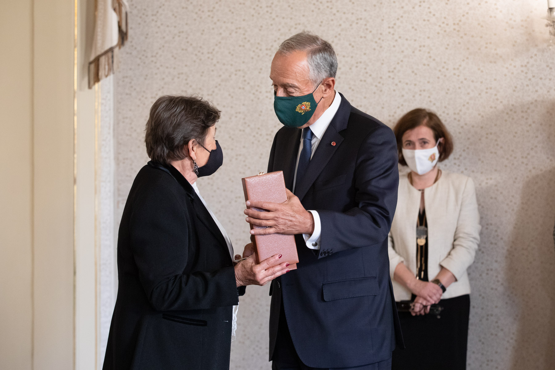 Numa cerimónia restrita no Palácio de Belém, o Presidente da República, após usar da palavra, entregou as insígnias à viúva do homenageado, Maria do Carmo Gaudêncio Carreira.