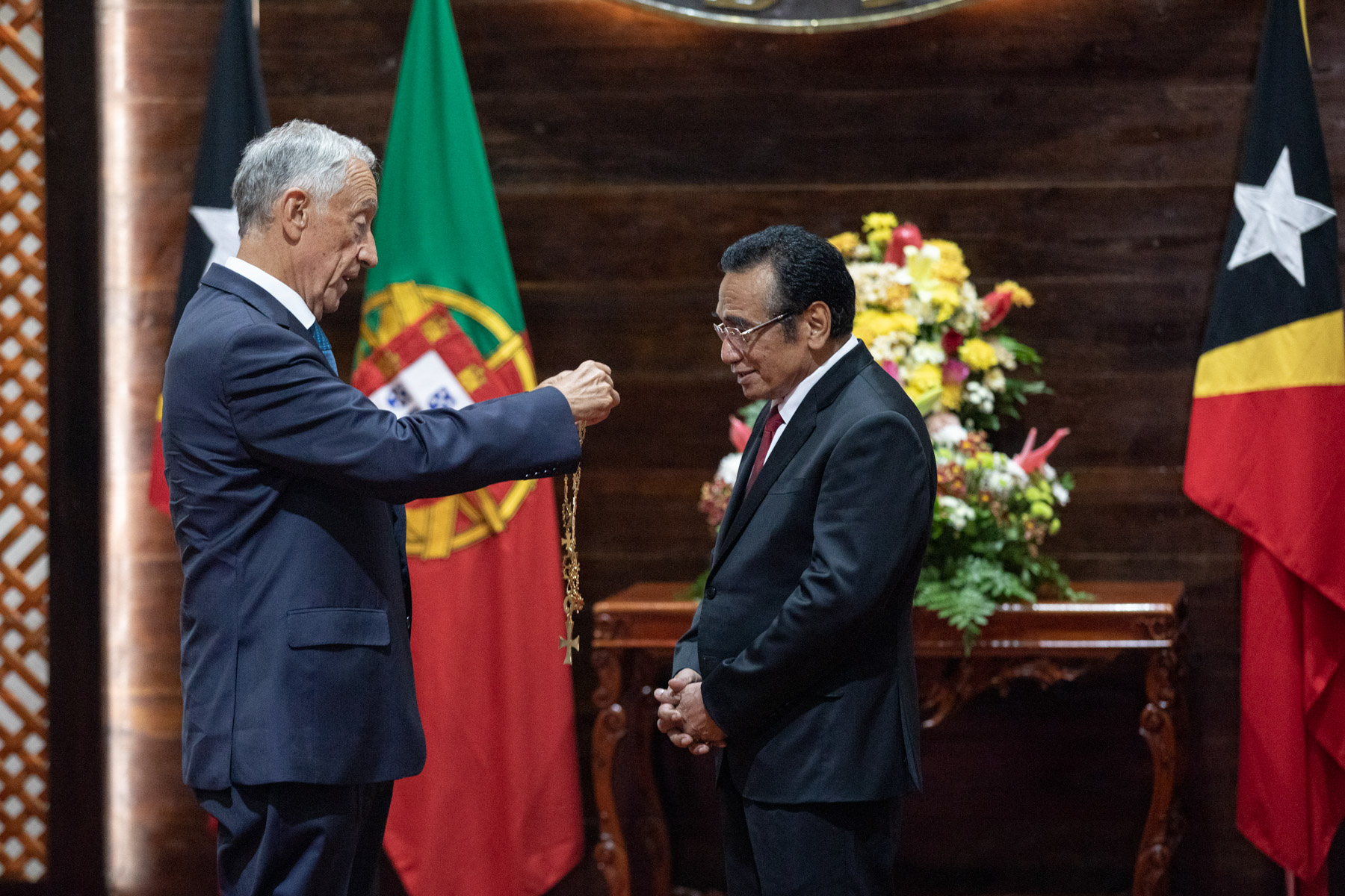 O Presidente Marcelo Rebelo de Sousa condecorou o Presidente da República Democrática de Timor-Leste, Francisco Guterres Lú-Olo, com o Grande-Colar da Ordem do Infante D. Henrique, numa cerimónia no Palácio Presidencial.
