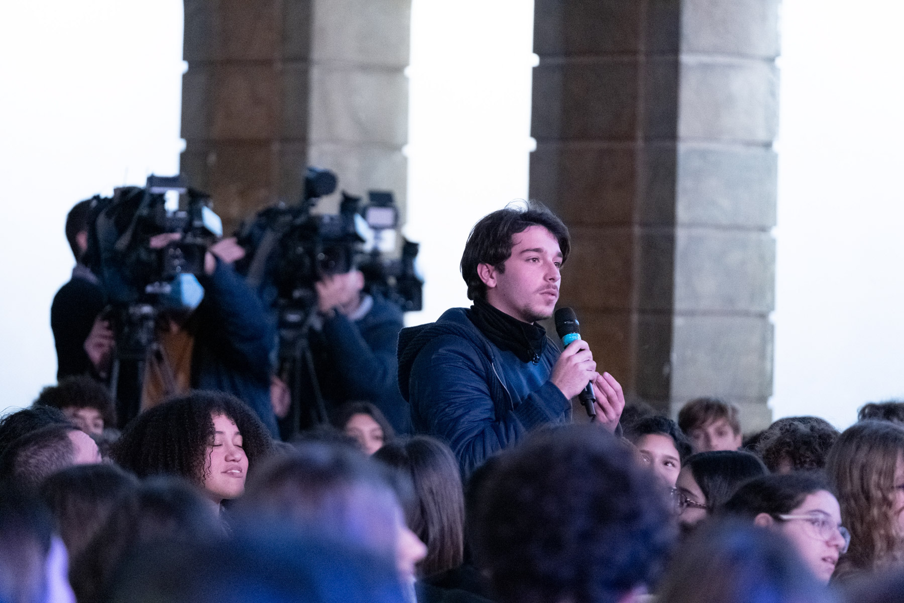 Durante a sessão, o músico manteve uma conversa com os alunos sobre o seu percurso artístico e de vida, e interpretou alguns dos seus temas musicais.