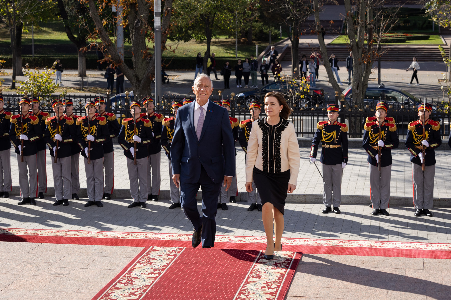 Foram prestadas Honras Militares, incluindo a execução dos Hinos Nacionais dos dois países, revista e desfile da Guarda de Honra. Após a cerimónia, os dois Chefes de Estado deslocaram-se ao interior do palácio para a fotografia oficial. Em seguida, houve uma reunião entre o Presidente Marcelo Rebelo de Sousa e a Presidente Maia Sandu, alargado depois às respetivas delegações.