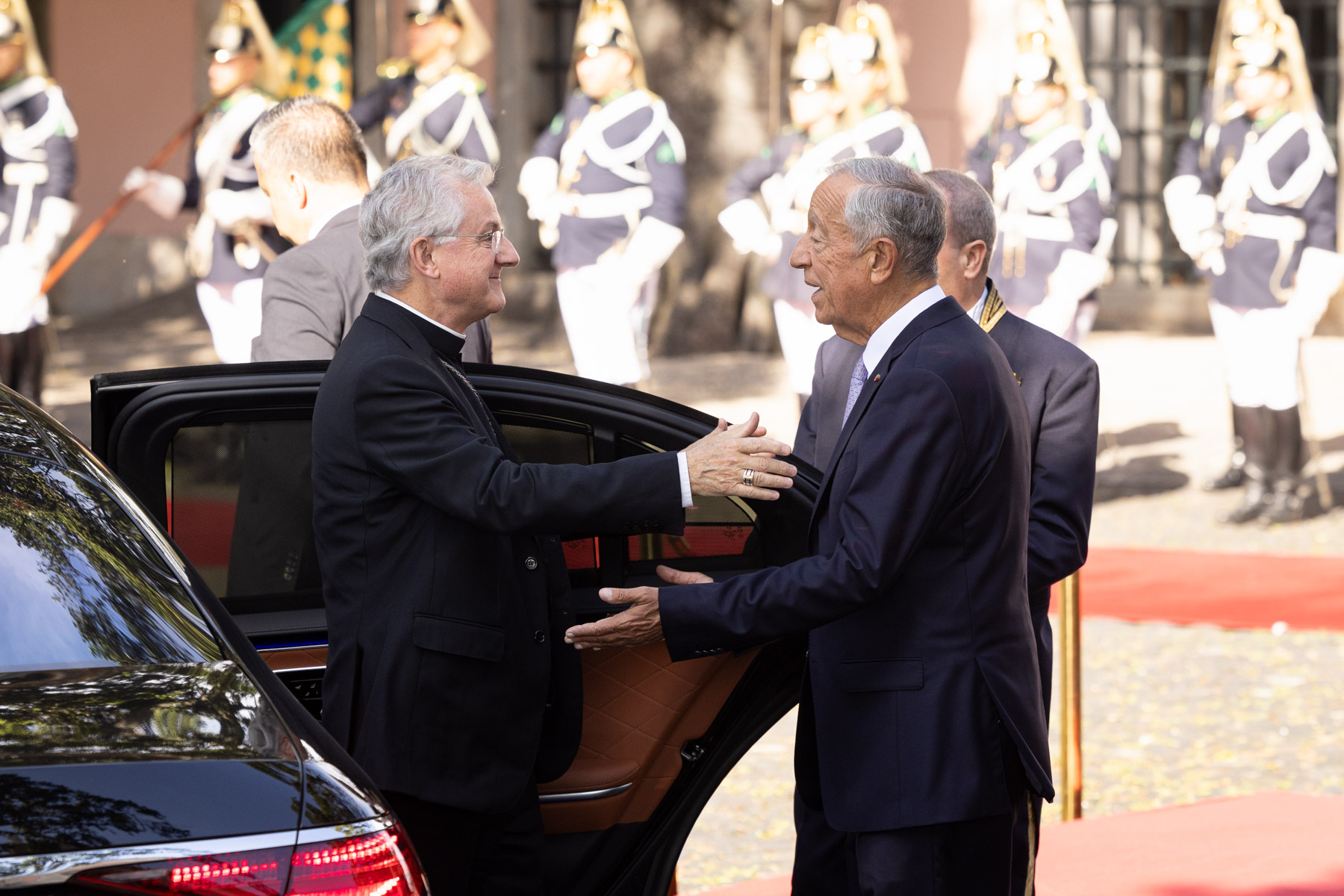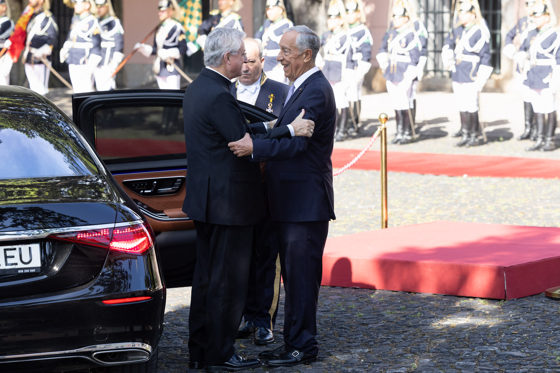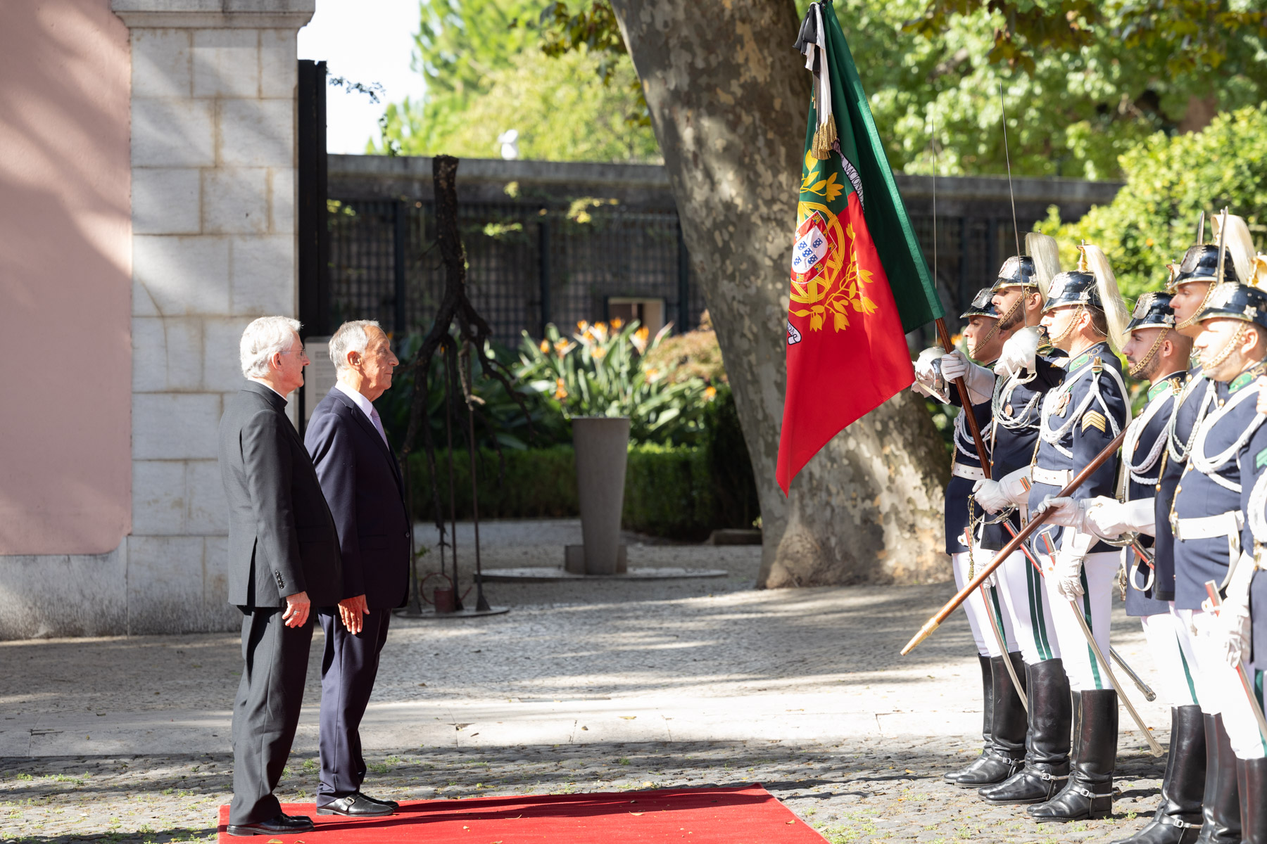 No Pátio dos Bichos, onde decorreu a cerimónia de boas-vindas, os Chefes de Estado realizaram a revista à Guarda de Honra do Esquadrão Presidencial da GNR, dirigindo-se, de seguida, à Sala das Bicas para a fotografia oficial e assinatura do livro de honra.