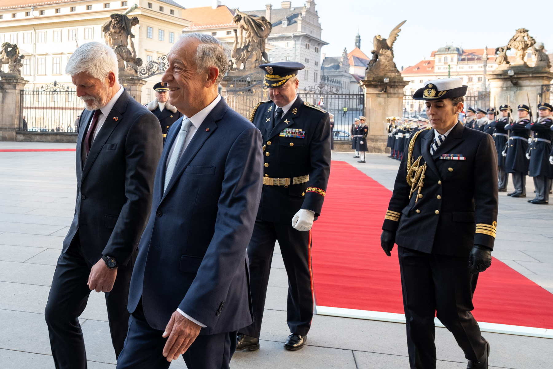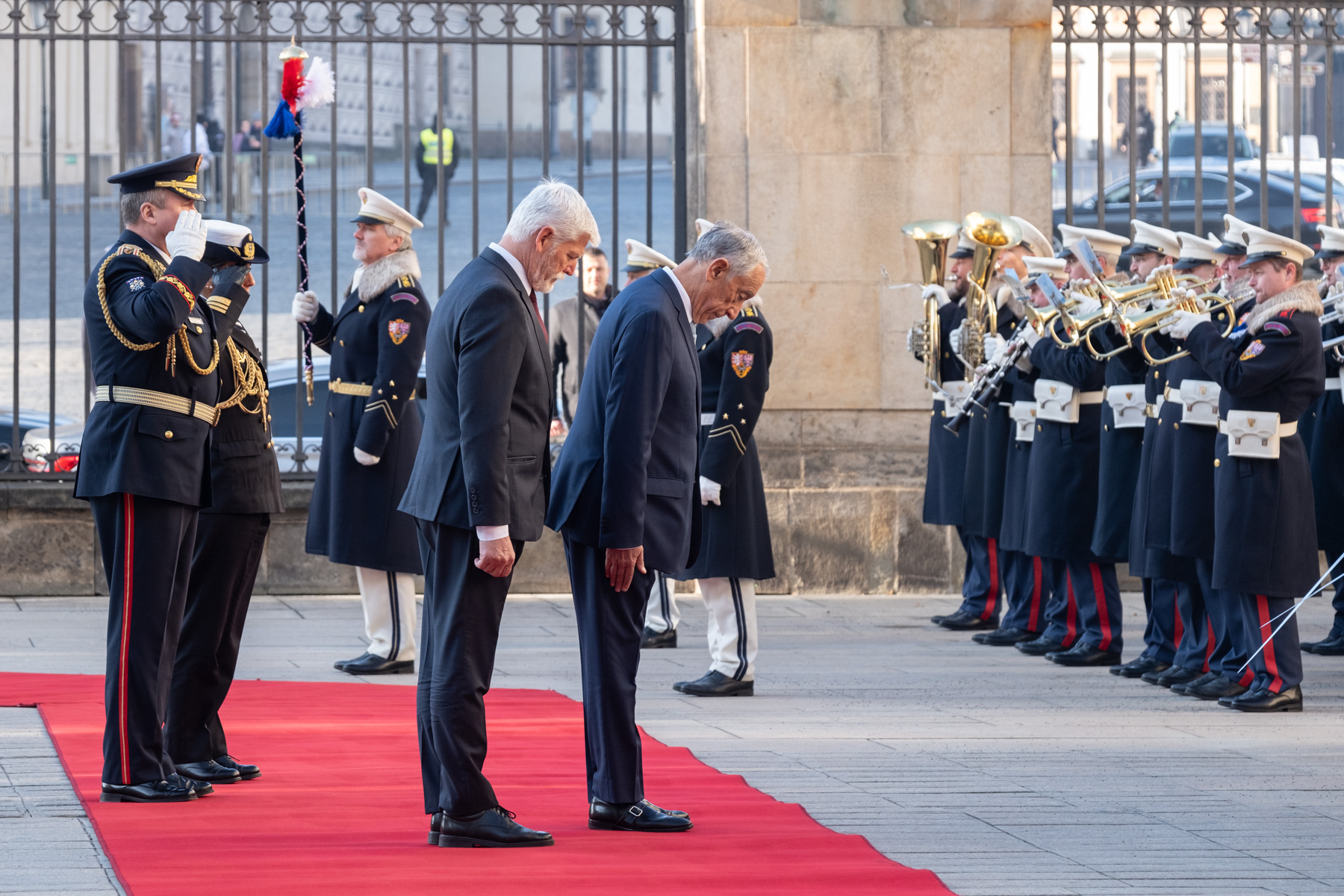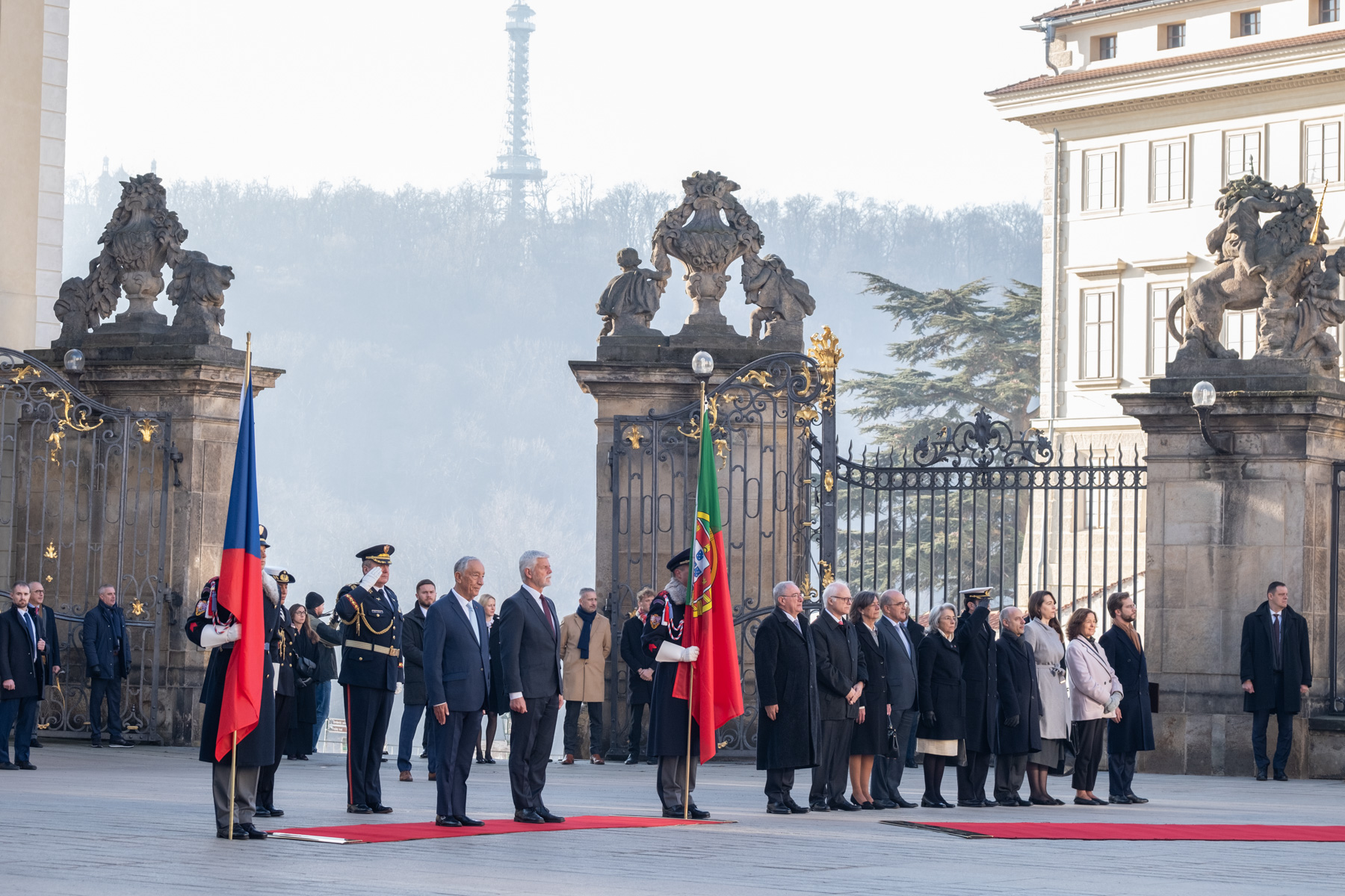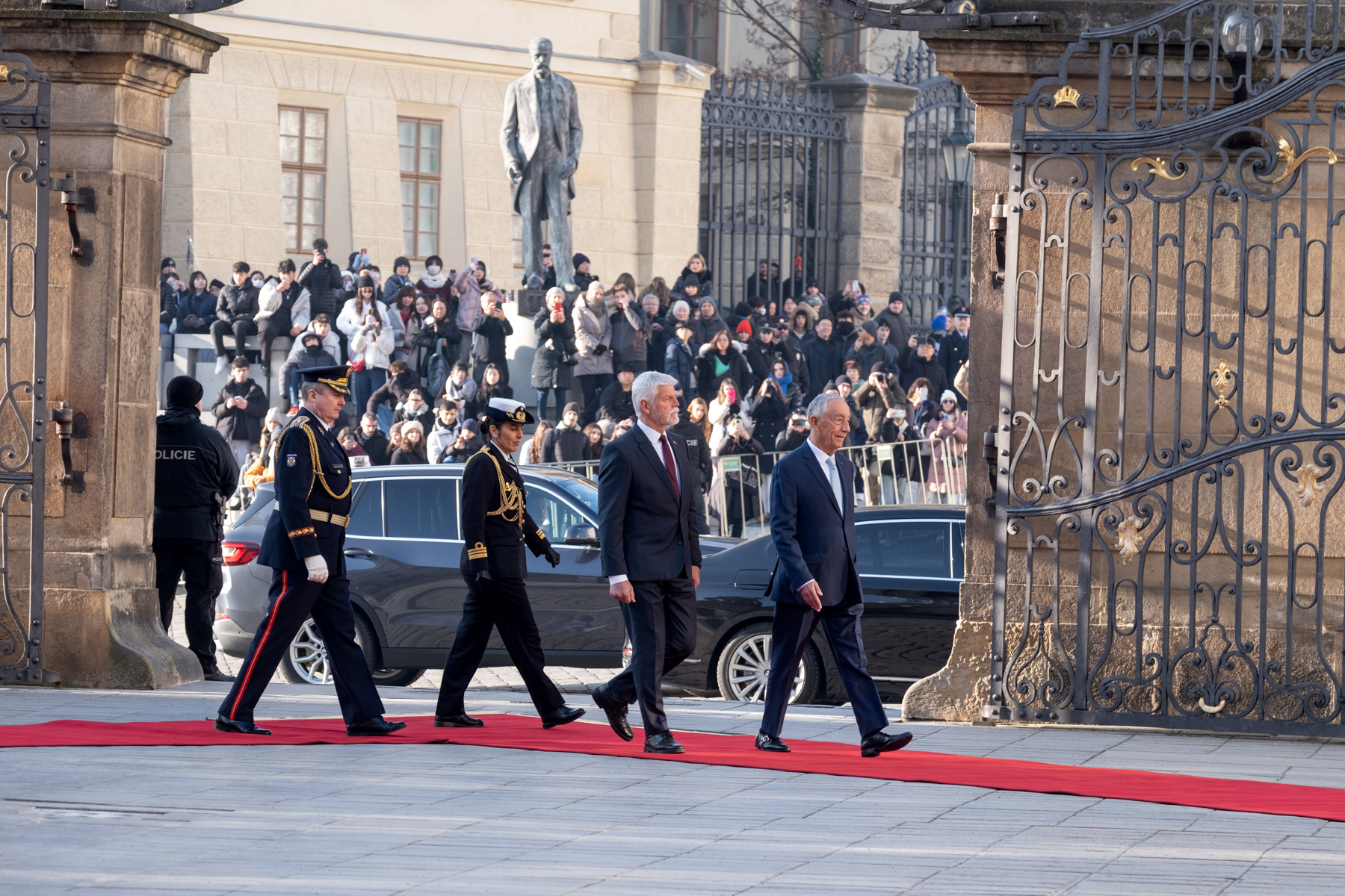 O Presidente da República foi recebido, no Castelo de Praga, pelo Presidente Petr Pavel. Na Cerimónia oficial de boas-vindas foram prestadas Honras Militares, com a execução dos Hinos Nacionais dos dois países e revista à Guarda de Honra.