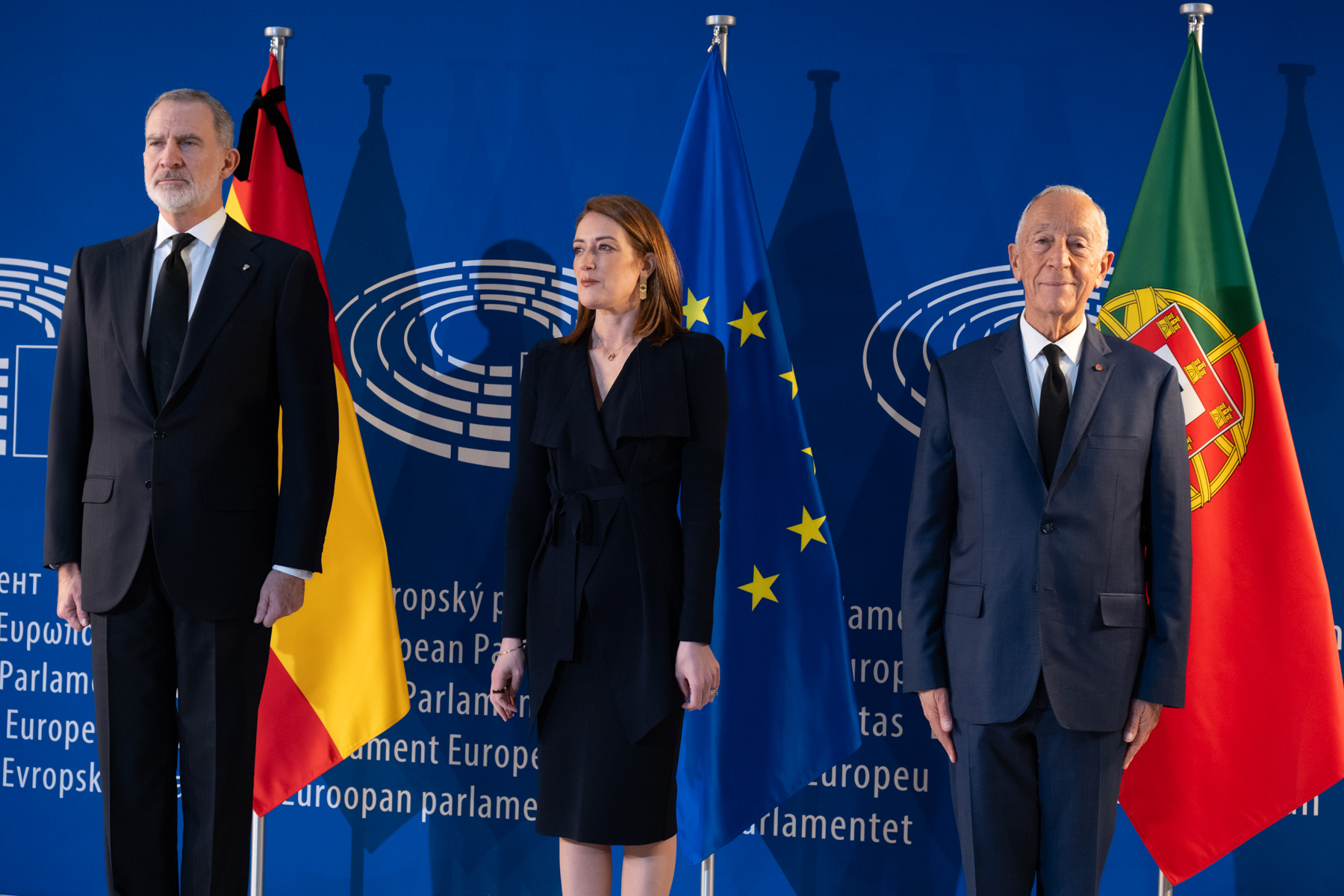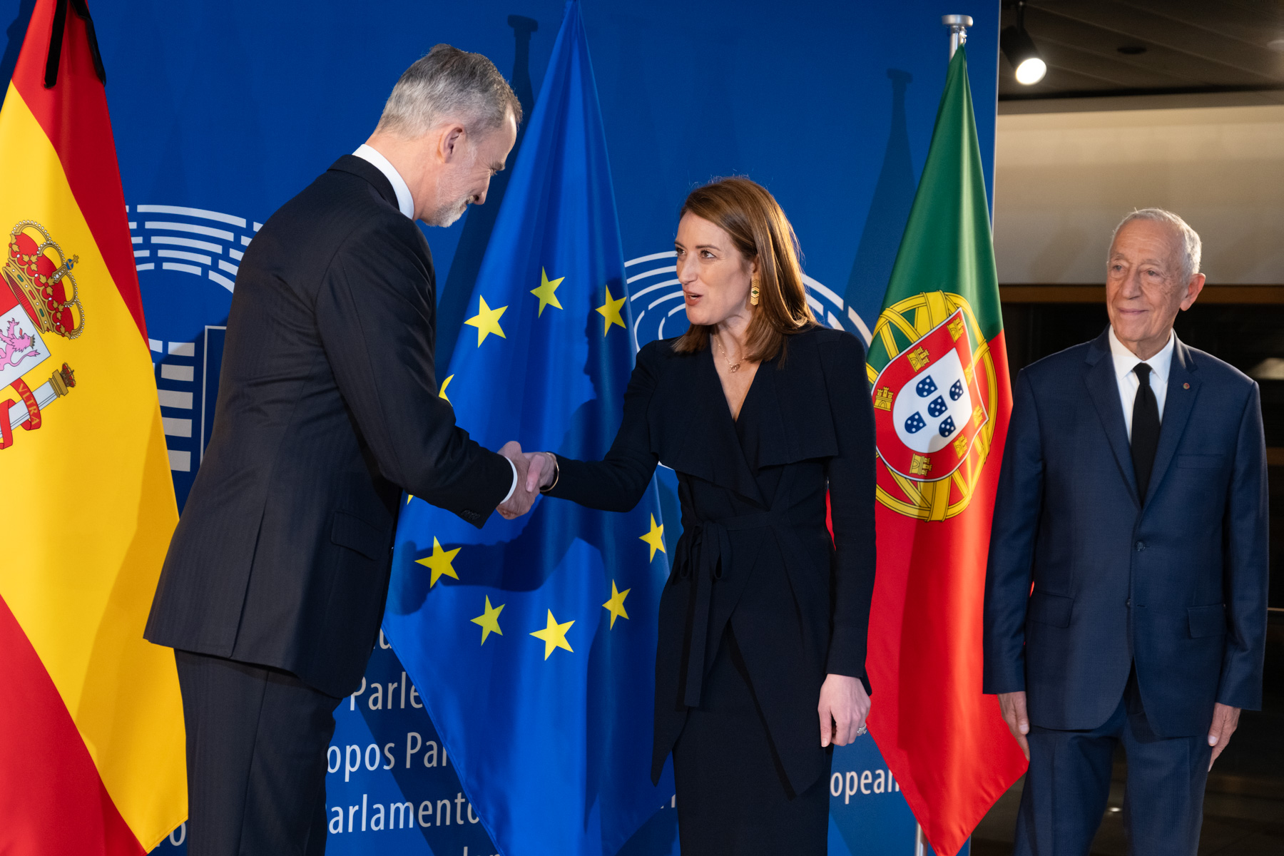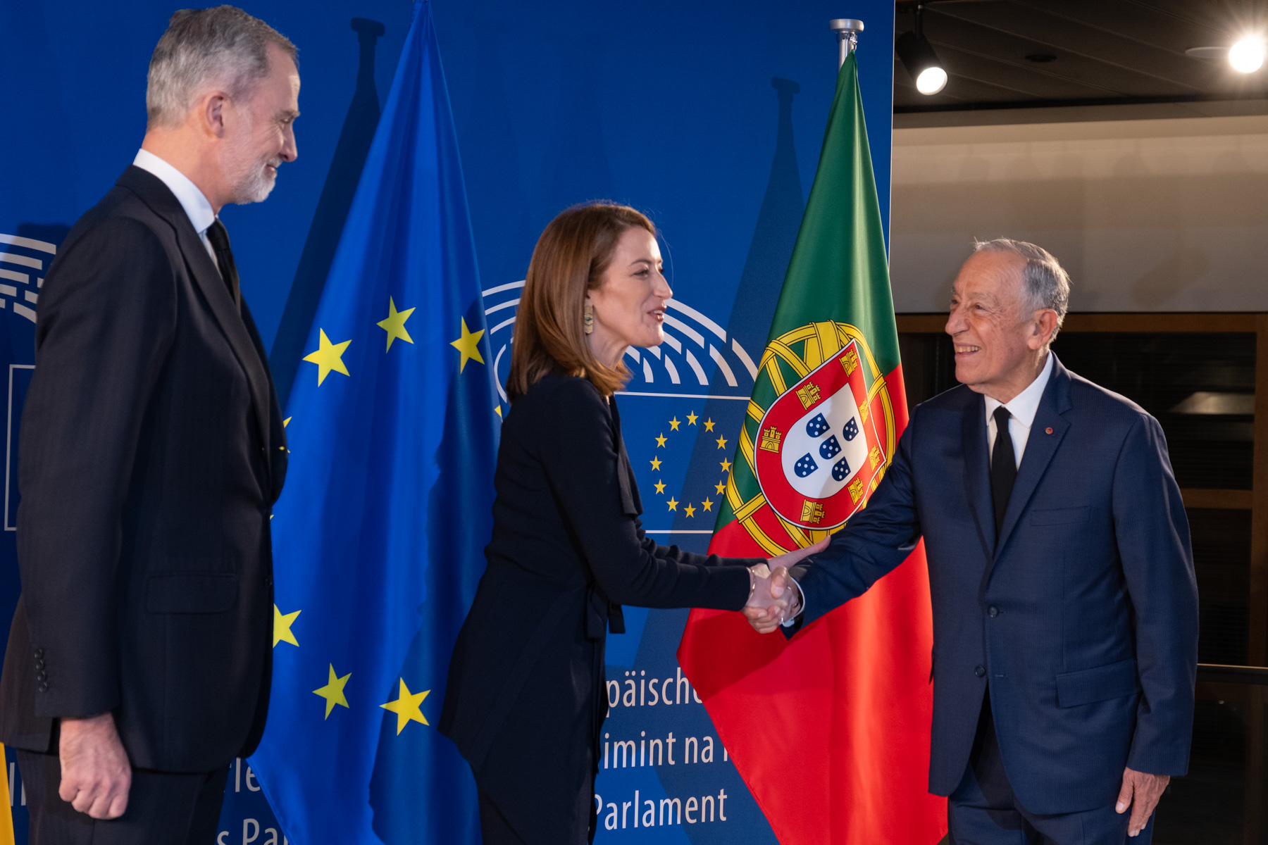 O Presidente da República e Sua Majestade o Rei de Espanha foram recebidos pela Presidente do Parlamento Europeu Roberta Metsola, no âmbito das comemorações do 40.º aniversário da adesão de Portugal e da Espanha à União Europeia.