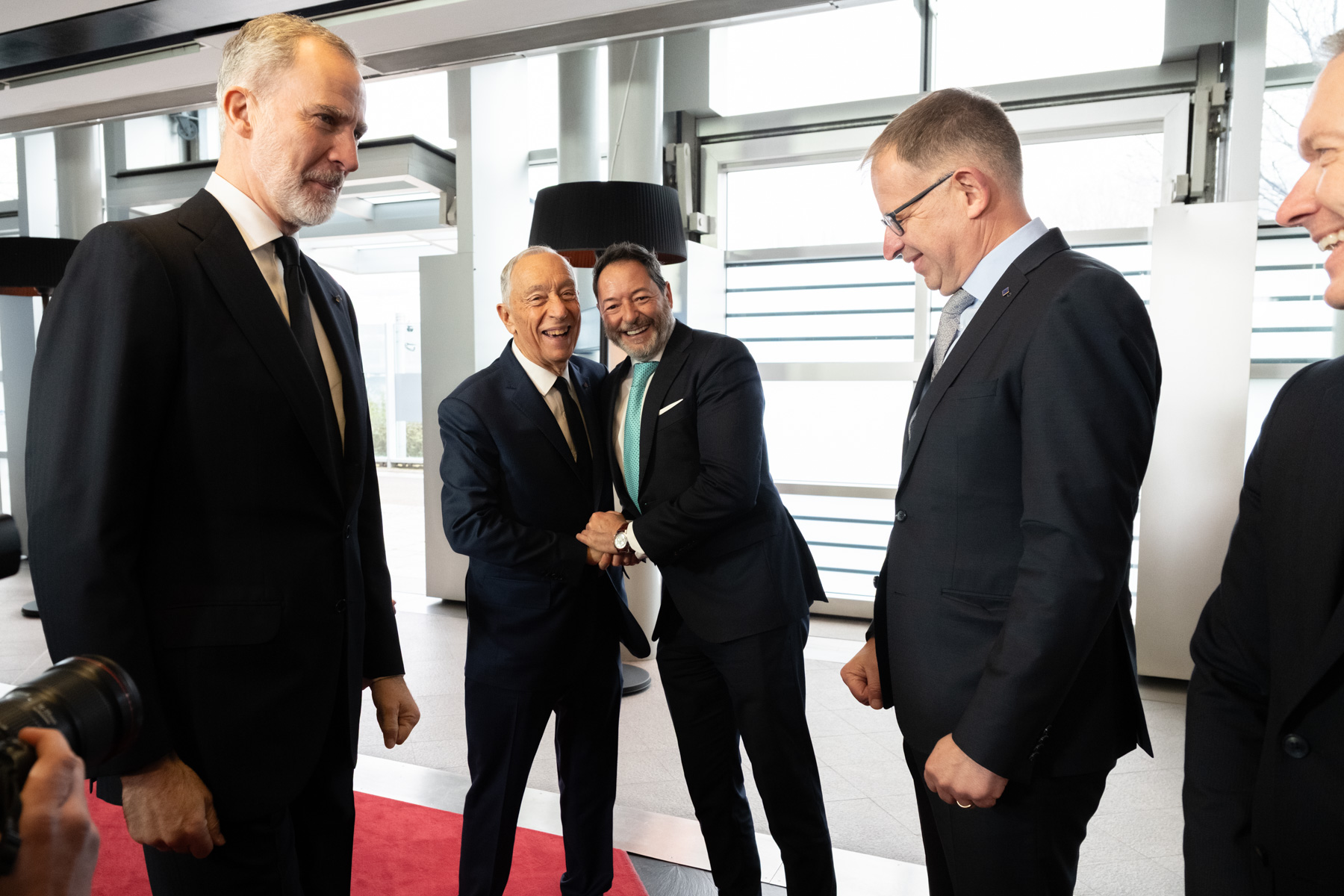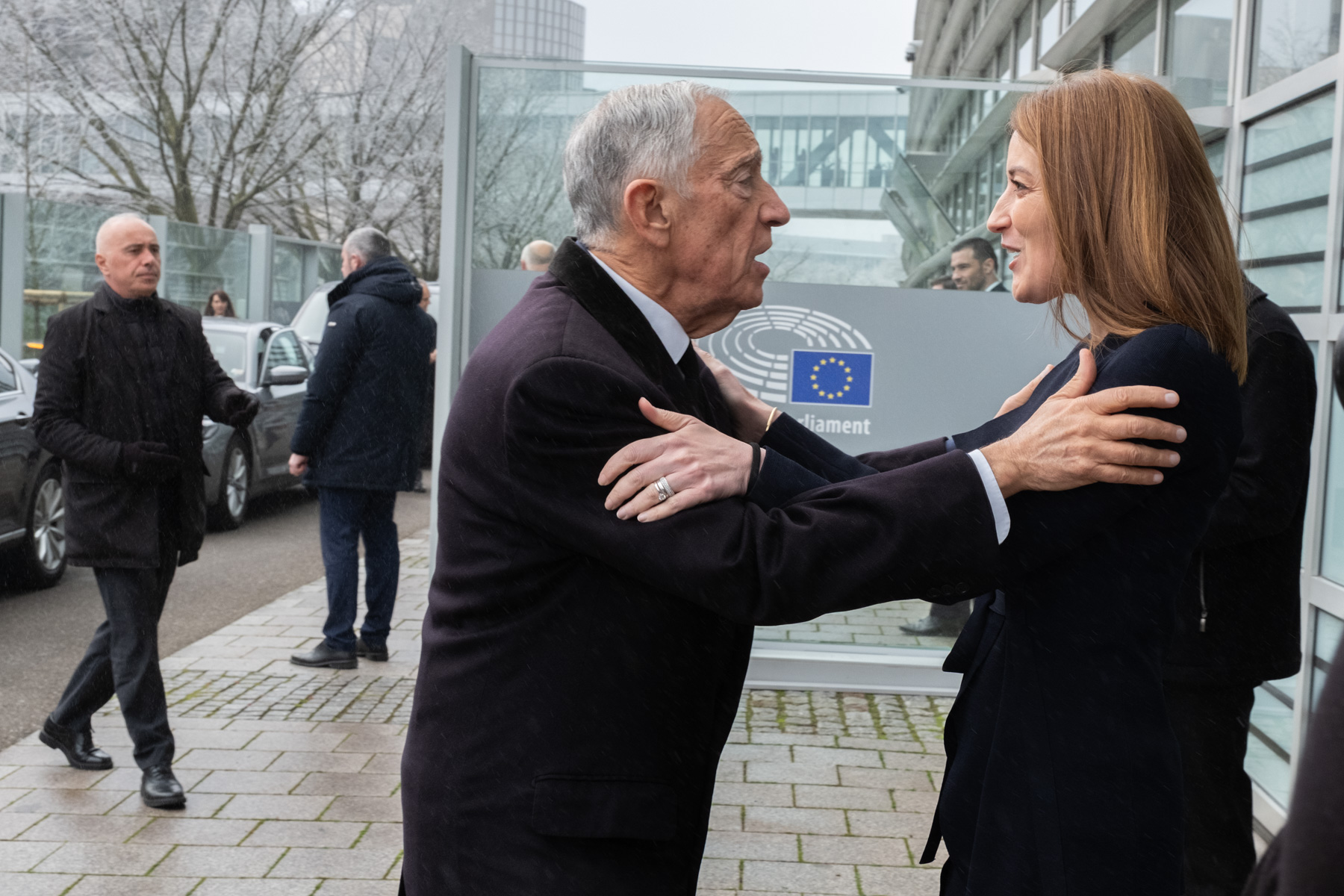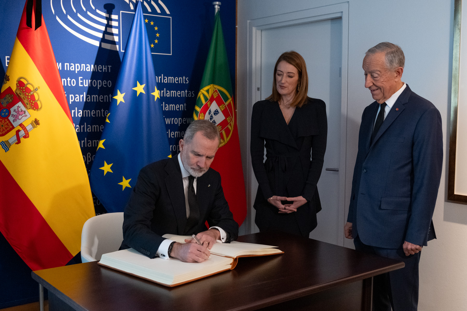 O Presidente da República e Sua Majestade o Rei de Espanha foram recebidos pela Presidente do Parlamento Europeu Roberta Metsola, no âmbito das comemorações do 40.º aniversário da adesão de Portugal e da Espanha à União Europeia.